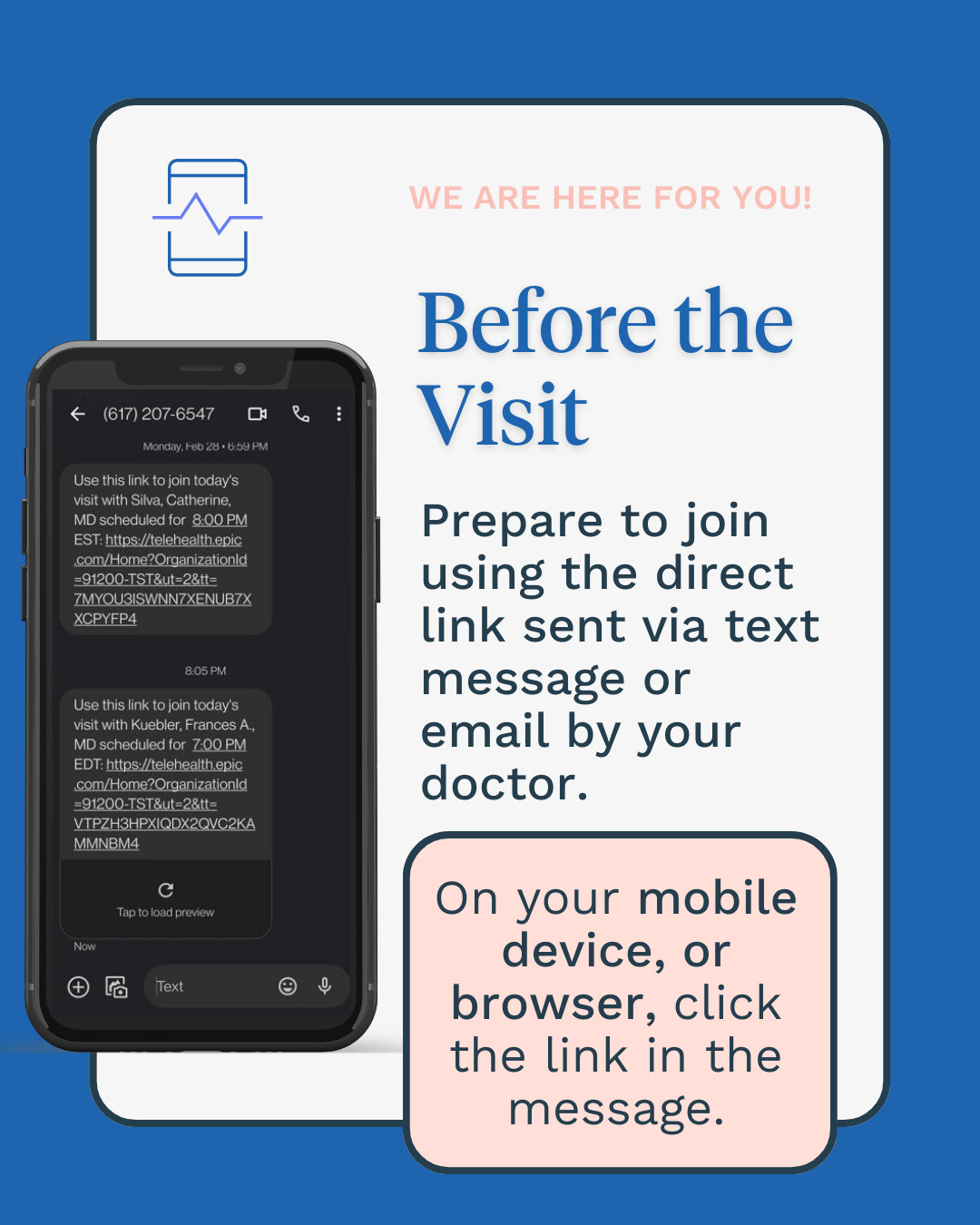 Just like a normal in-person visit, you can send messages to your provider using the MyChart platform. For more information, click here, call Patient Services at 617-568-4600, or email MyChartSupport@neighborhealth.com.