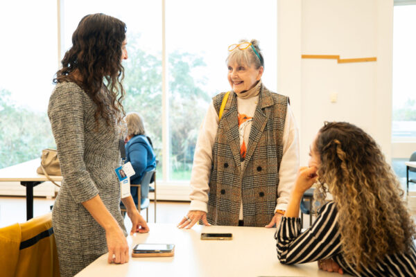 Ashley Casey, Director of Quality and Clinical Initiatives, Neighborhood PACE, and Lidia Hernandez, Member Experience Manager, Neighborhood PACE, chat with Revere PACE participant Joanne LaRosa at the event at 10 Garofalo Street.