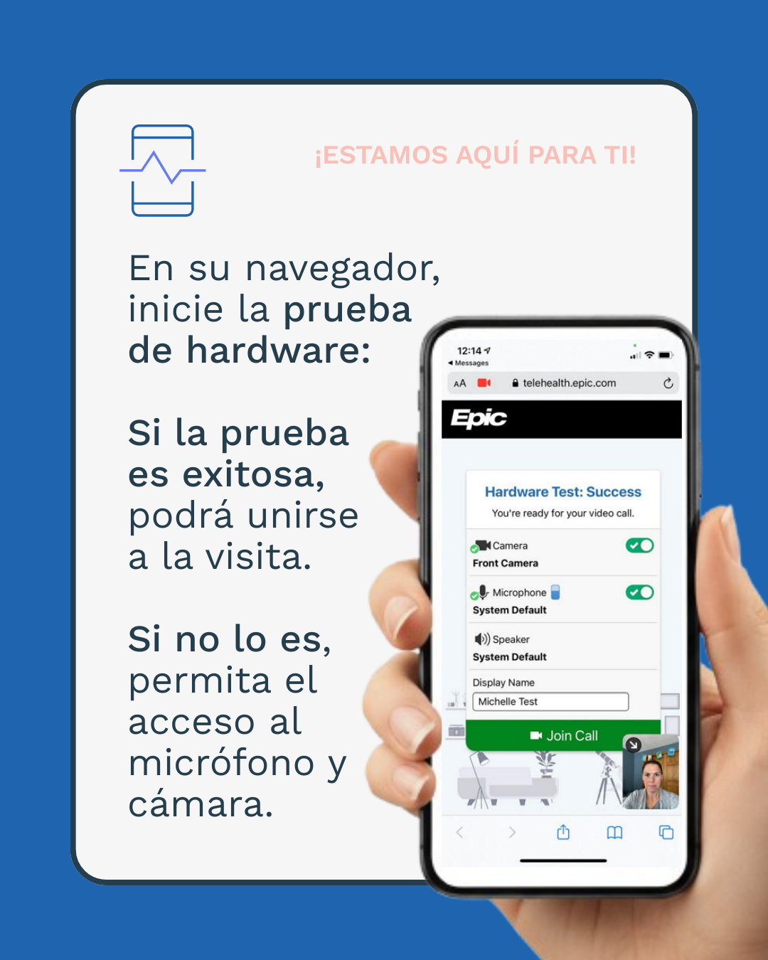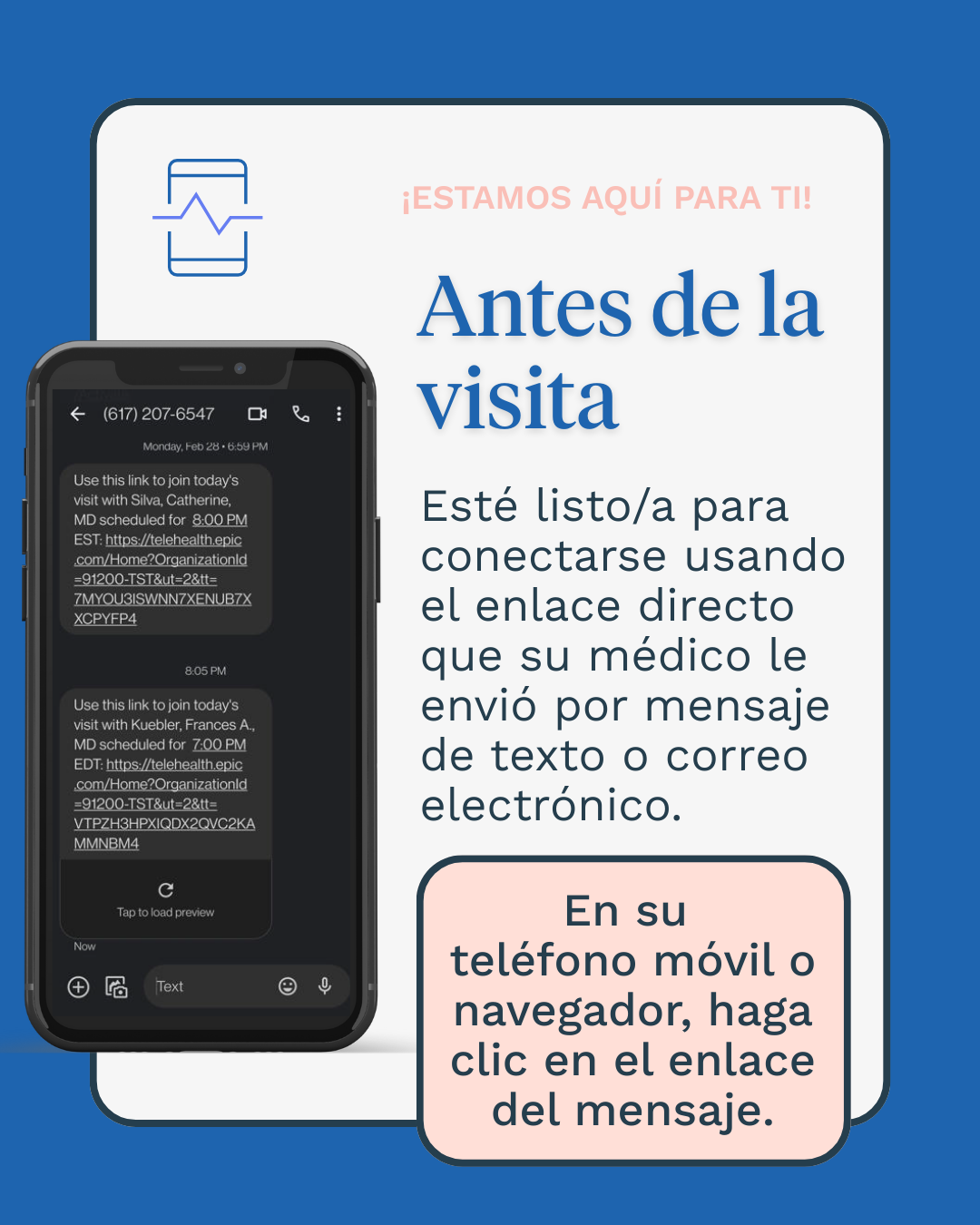 ¡Es muy fácil! Recibirá un enlace por mensaje de texto cuando su médico esté listo. Haga clic en el enlace, siga las indicaciones y espere a que su médico se una a la visita.