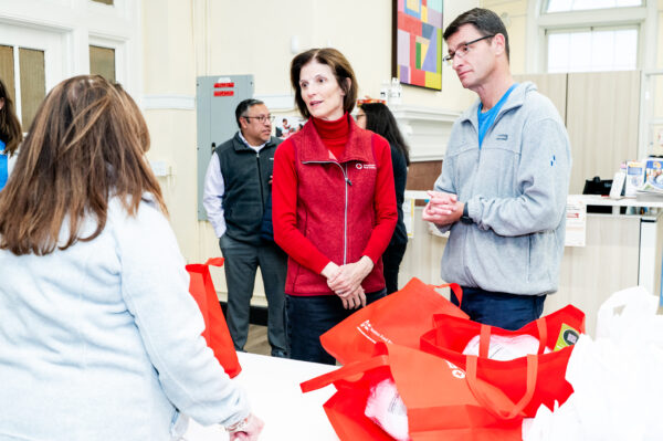 American Red Cross Massachusetts CEO Holly Grant and NeighborHealth Interim CEO Jamie Hazard discuss East Boston food distribution with NeighborHealth Director of Health Promotion Kathy Field.
