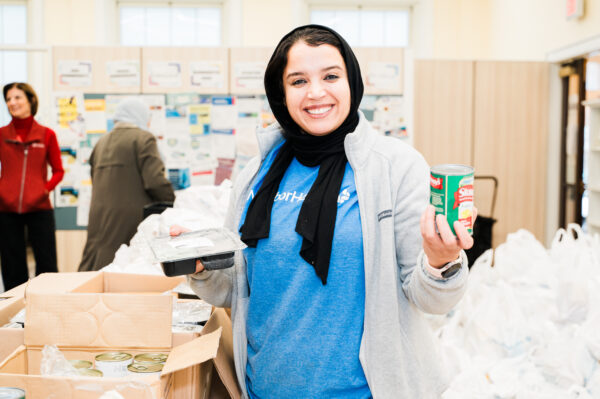 NeighborHealth Care Navigator Hanan Lahmouch helps prepare food items being distributed for Thanksgiving at the health center’s East Boston distribution site.