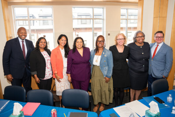 From left to right: Michael Curry, President and CEO, Massachusetts League of Community Health Centers; Viveka Prakash-Zawisza, MD, MS, MBA, FACOG, Senior Medical Director, MassHealth; Elaine Fitzgerald Lewis, DrPH, MIA, Director of the Bureau of Family and Nutrition, MA Department of Public Health; Massachusetts Senator Liz Miranda; Becky Cruz-Crosson, Director of Healthy Start Systems Division, Boston Public Health Commission; Christin Price, MD, Perinatal and Neonatal Quality Improvement Network, MA Department of Public Health; Mimi Gardner, LICSW, Vice President and Chief Equity Officer, NeighborHealth; David Seltz, Executive Director, Health Policy Commission.
